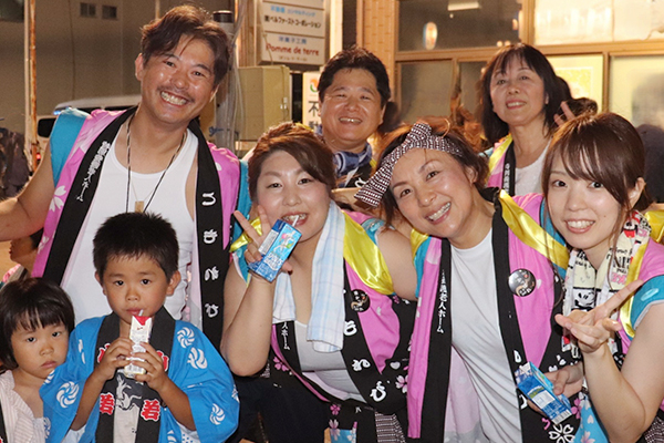 スタッフが家族や友達も誘って、清水みなと祭りの総踊りに参加。踊れる人も踊れない人も、地域の祭りに楽しく参加しています。